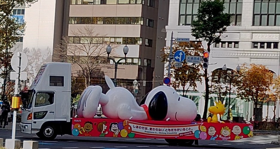 こんな感じで美容室へ送り届けた後に車を駐車場に止め、待ち時間があるので街中をぶらぶらしていると、巨大なスヌ-ピ-が街を移動していた。